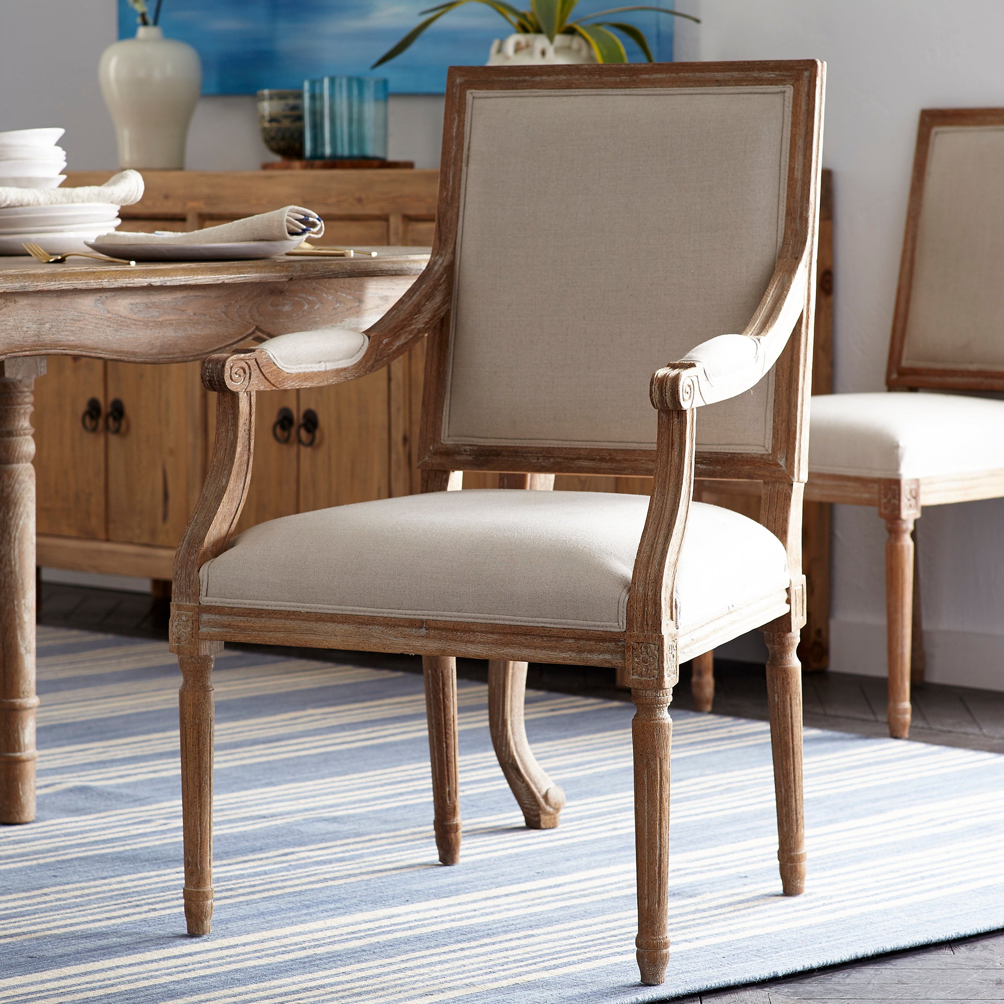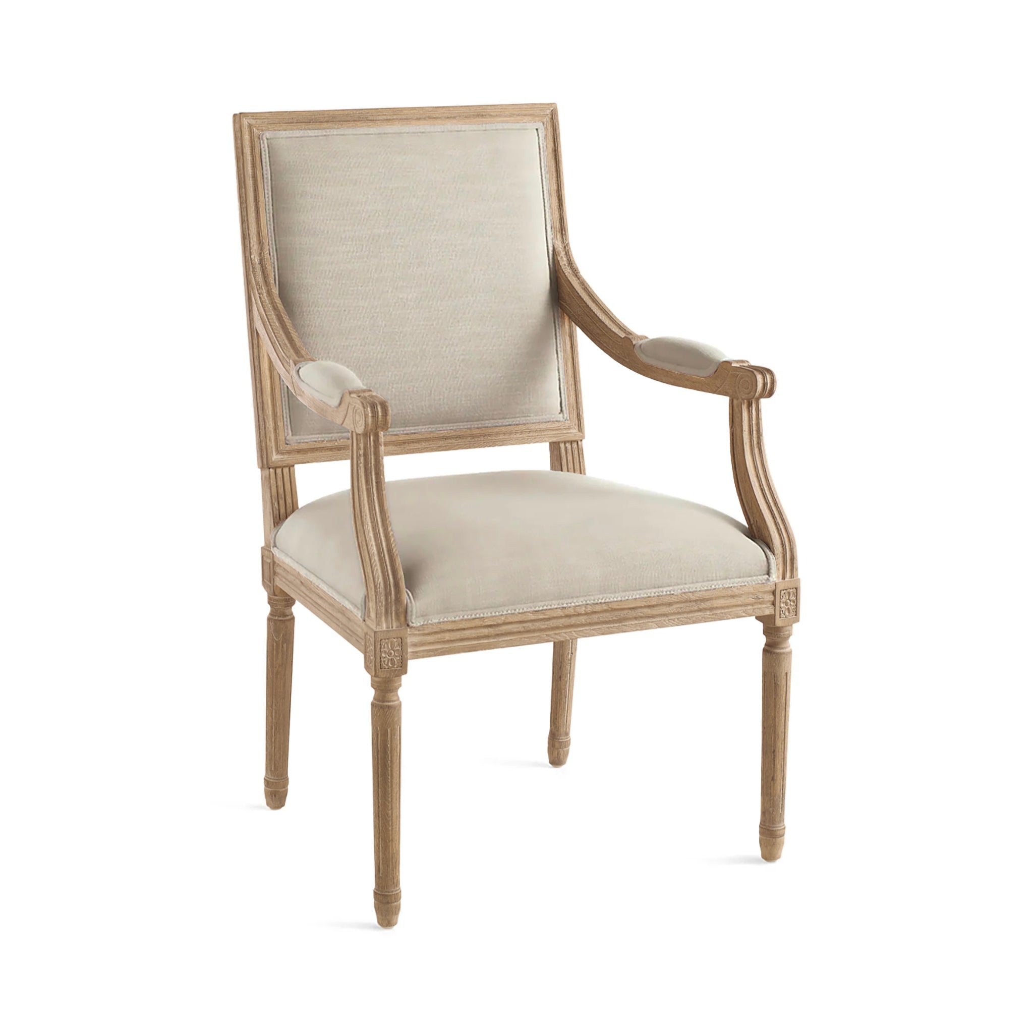The Chateau Chair With Arm draws inspiration from the timeless elegance of traditional French design, often seen in both countryside homes and city residences in the Loire Valley. Featuring a square back, padded armrests, and finely carved details, this chair combines understated sophistication with everyday comfort. Crafted with care, it offers the abundance of a lounge chair without the bulk, making it an heirloom piece in the making.