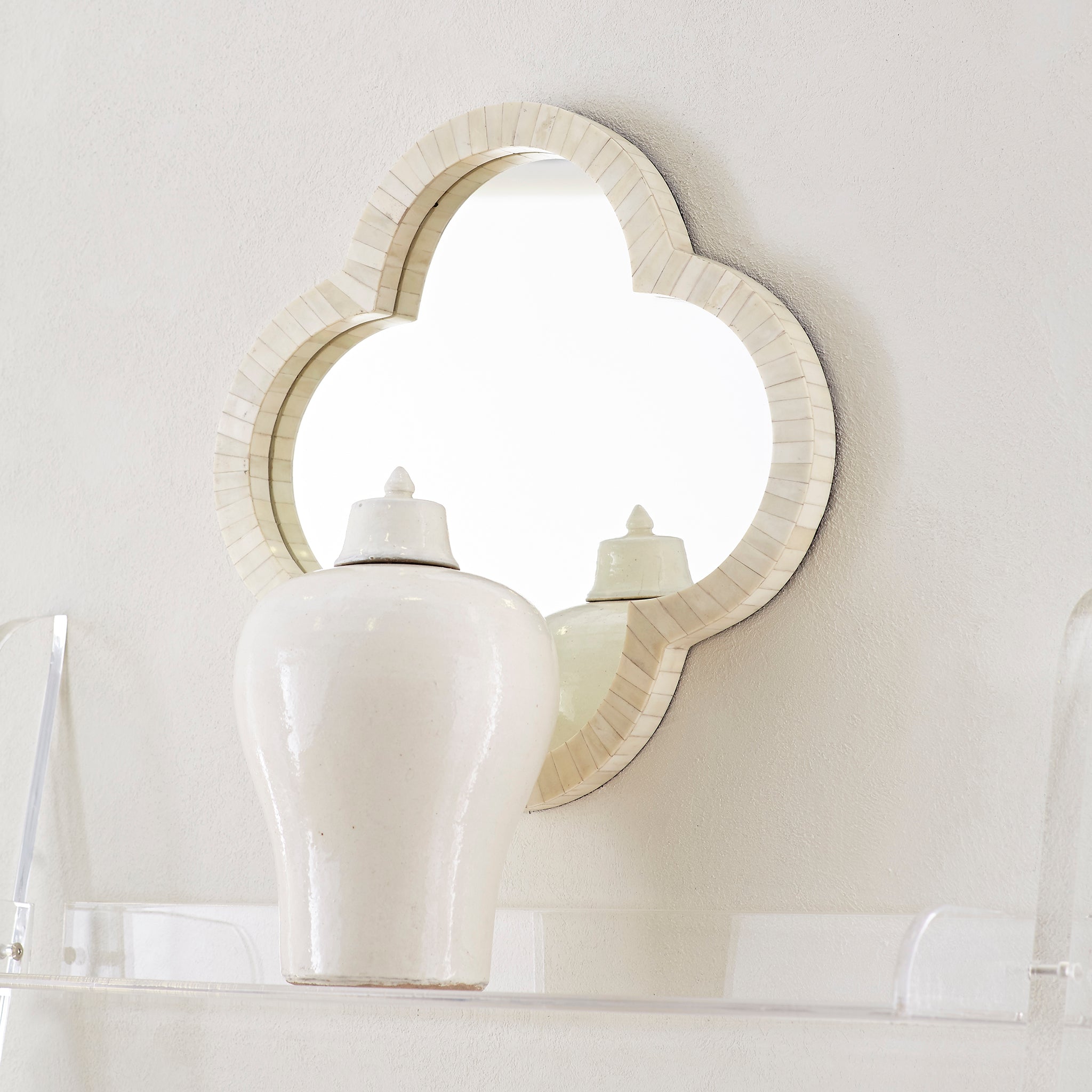 The Clover Bone Mirror is a striking blend of elegance and craftsmanship, featuring a delicate bone inlay frame shaped like a lucky four-leaf clover. This Wisteria exclusive adds a refined touch to any space, complementing both bold and neutral wall colors. Whether placed in an entryway, bedroom, or living room, its sculptural form and exquisite detailing make it a timeless decorative accent.