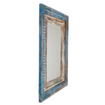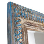 The Hand-Carved Jodhpur Mirror features intricate wood carvings in vibrant blue and gold tones. This artisanal piece adds a touch of traditional Indian craftsmanship, making it a standout accent for any space. Its unique design and vivid colors create a timeless piece with modern appeal.