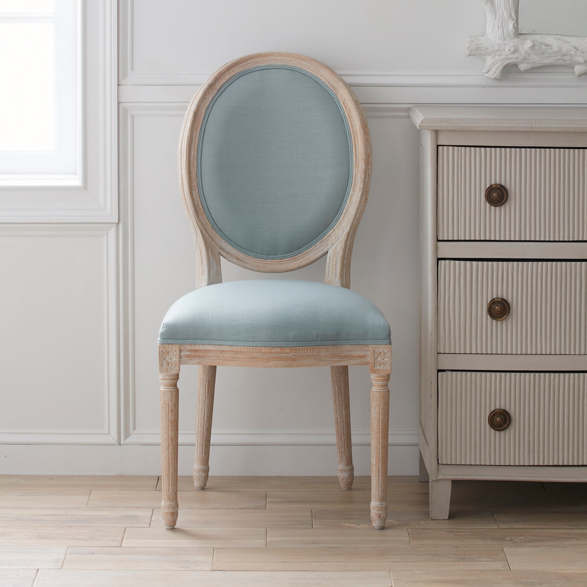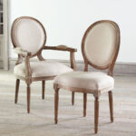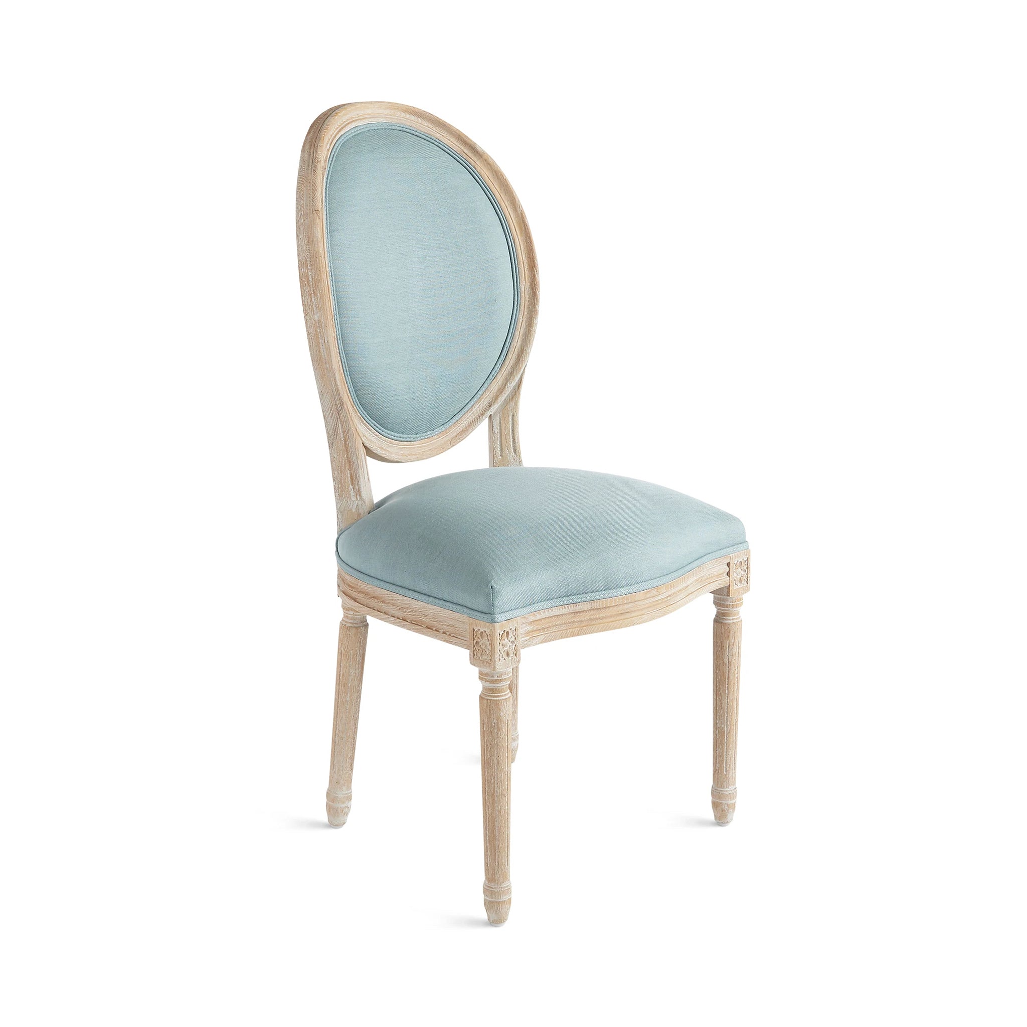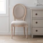 Crafted from solid oak with a timeless oval frame, the Louis XVI Side Chair offers comfort and style. Its classic linen upholstery complements the intricate detailing of the oak wood, creating an elegant addition to your dining area or entryway.